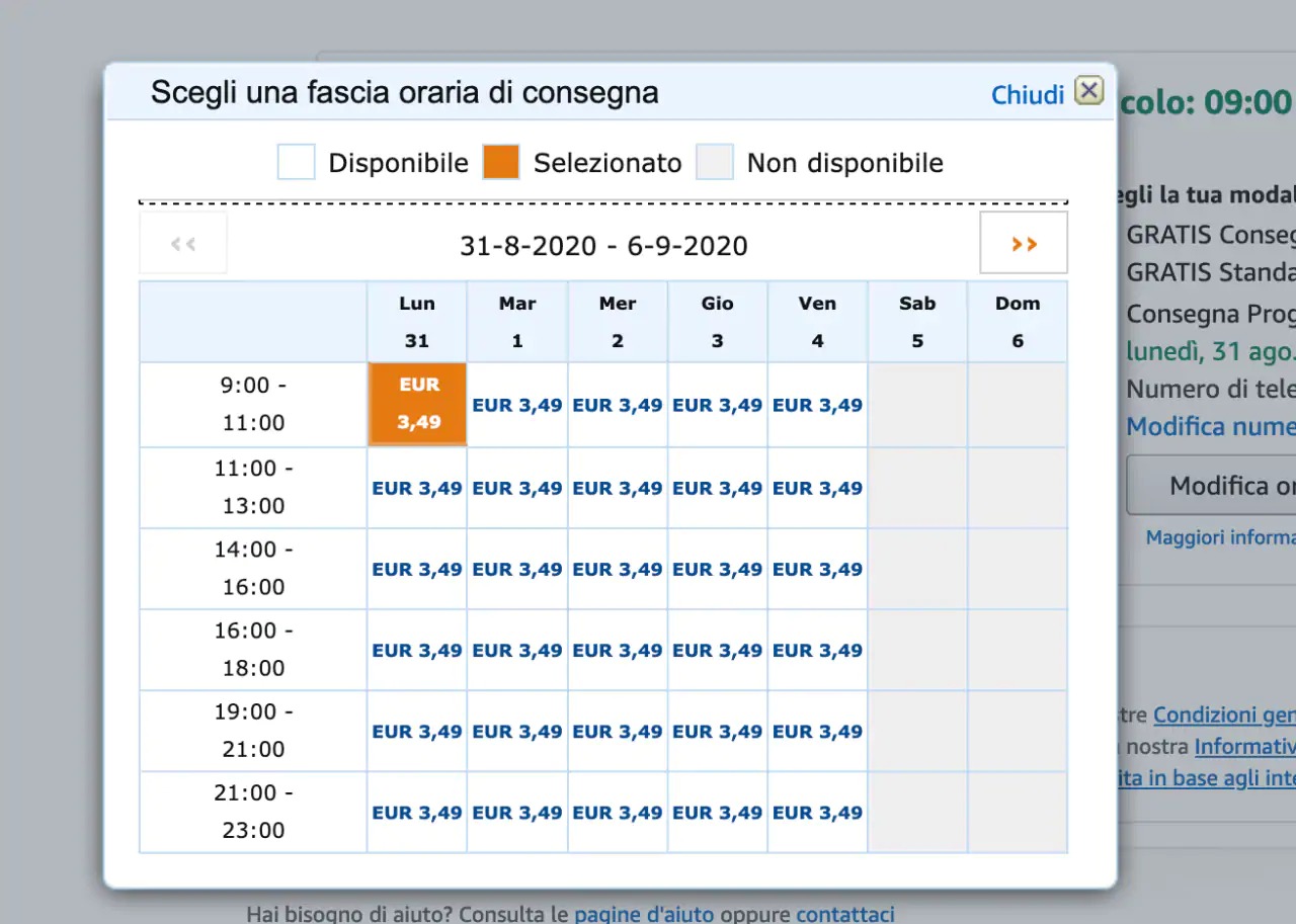 Sono sei le fasce orarie tra cui scegliere, 9:00-11:00, 11:00-13:00, 14:00-16:00, 16:18:00, 19:00-21:00 e 21:00-23:00, solo dal lunedì al venerdì, mentre il sabato e la domenica sono disponibili solo con la consegna classica. Molto comoda la possibilità di ricevere le consegne anche in tarda serata, ottimo per chi lavora fino a tardi e non sa dove far recapitare pacchi che contengono prodotti costosi.