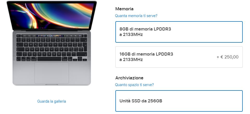 Per quanto riguarda lo store italiano, il passaggio da 8 GB a 16 GB di RAM al momento della scelta del MacBook Pro da 13 pollici comporta un aumento del prezzo di 250 euro (qui trovate la pagina dedicata sul sito del produttore).