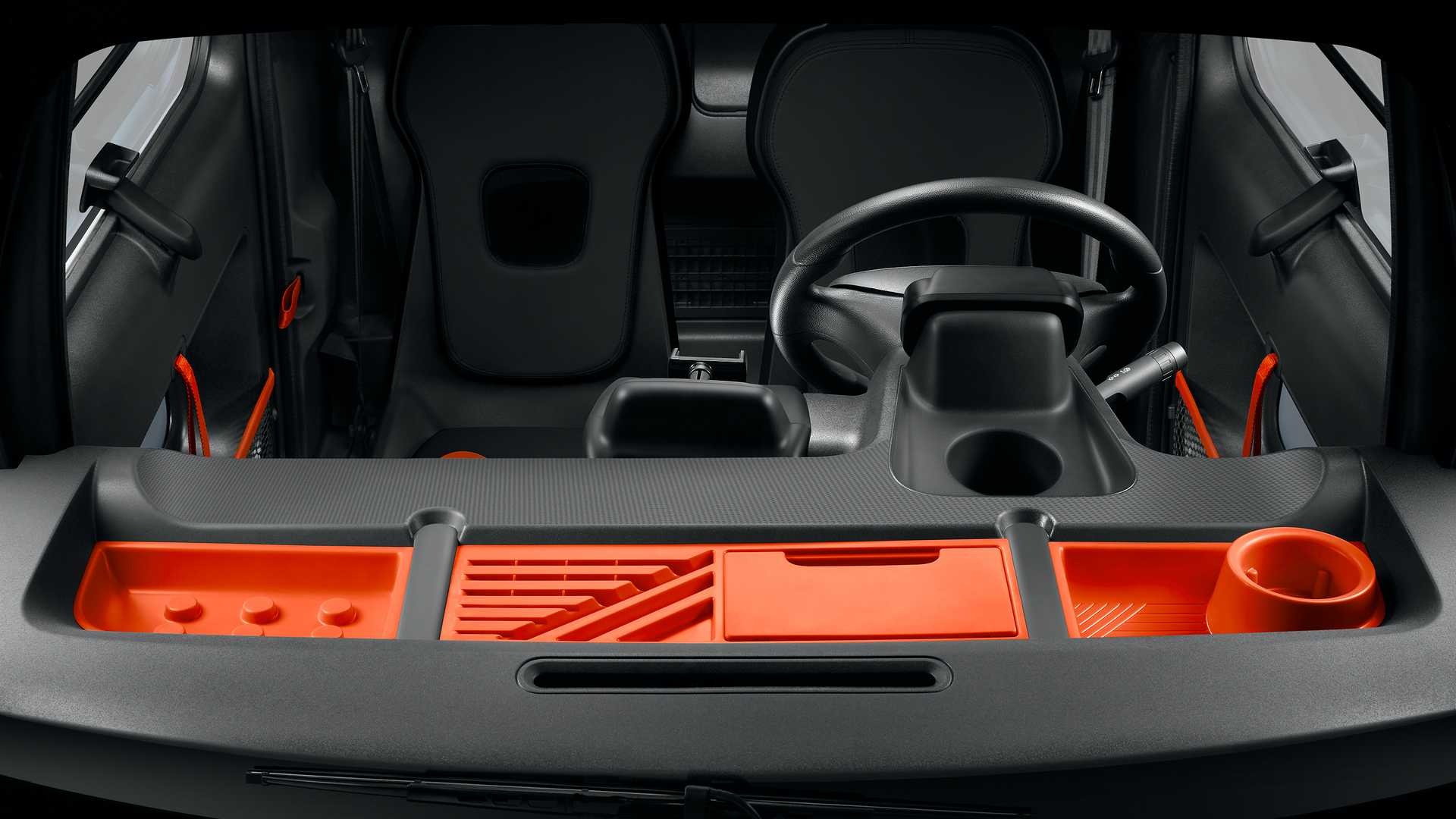 Particolare l’apertura differenziata delle portiere: tradizionale per il passeggero, controvento per il guidatore. In questo modo si riducono i costi visto che la stessa porta può essere montata su entrambi i lati. Manca un monitor per l’infotainment e al suo posto troviamo un dock per lo smartphone che diventa il cuore dell’auto, mancano anche le maniglie per le porte, sostituite da fettucce in tessuto e i vetri vanno aperti manualmente.
