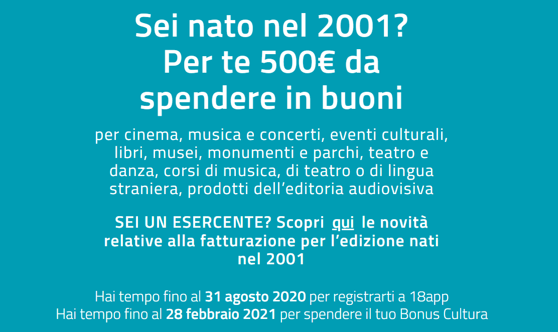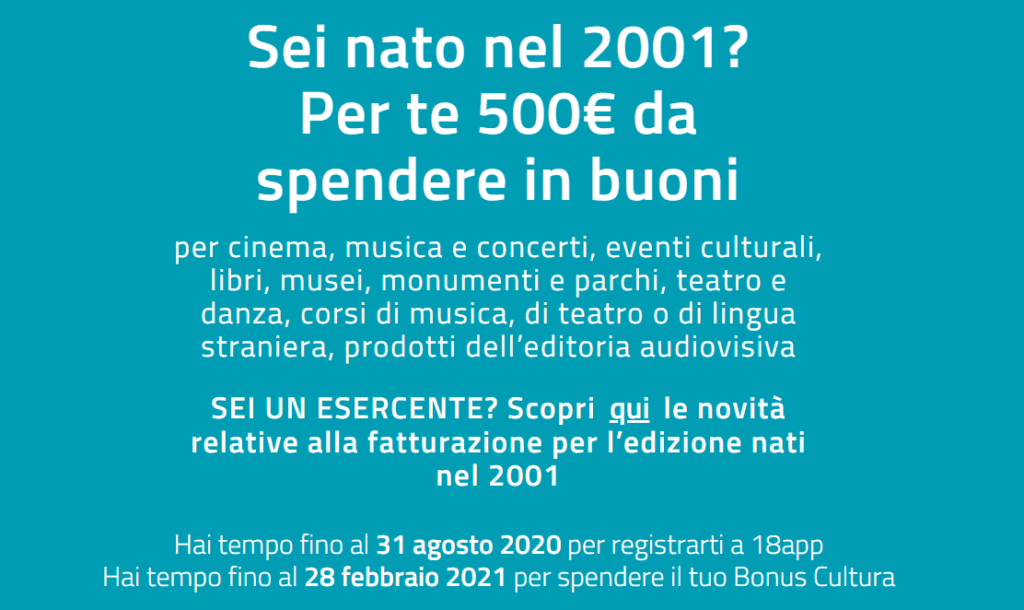 Il Bonus Cultura è un’iniziativa per promuovere la cultura tra i giovani ed è destinato a chi ha compiuto 18 anni nel corso del 2019. Consente di ottenere 500 euro in buoni da spendere per cinema, musica, concerti, eventi culturali, libri, musei, monumenti, parchi, teatri, danza, prodotti dell’editoria, corsi di musica, di teatro o di lingua straniera.