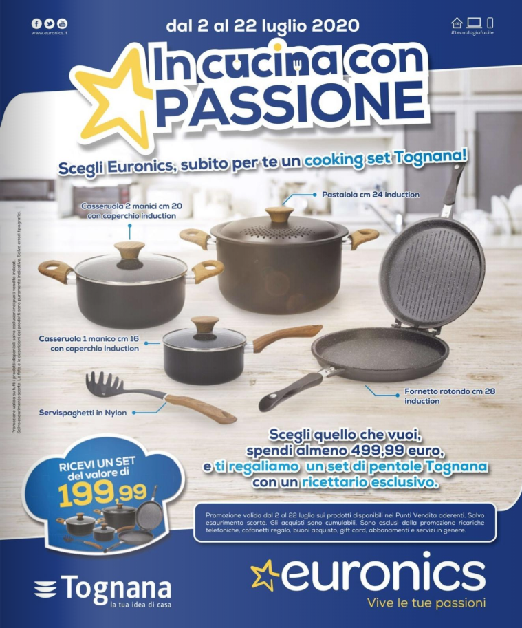 Euronics lancia anche i nuovi volantini, con offerte diverse in base al gruppo e di conseguenza alla zona d’Italia. Se da Euronics CDS arriva infatti il volantino Rott’Amo” (dal 2 al 22 luglio 2020), da Dimo arriva “La tecnologia è servita!” (fino al 15 luglio 2020), mentre altri punti vendita si danno alla cucina attraverso le promozioni “In cucina con passione”, che regalano set di pentole Tognana (fino al 15 luglio da La Via Lattea e fino al 22 nei negozi Siem).