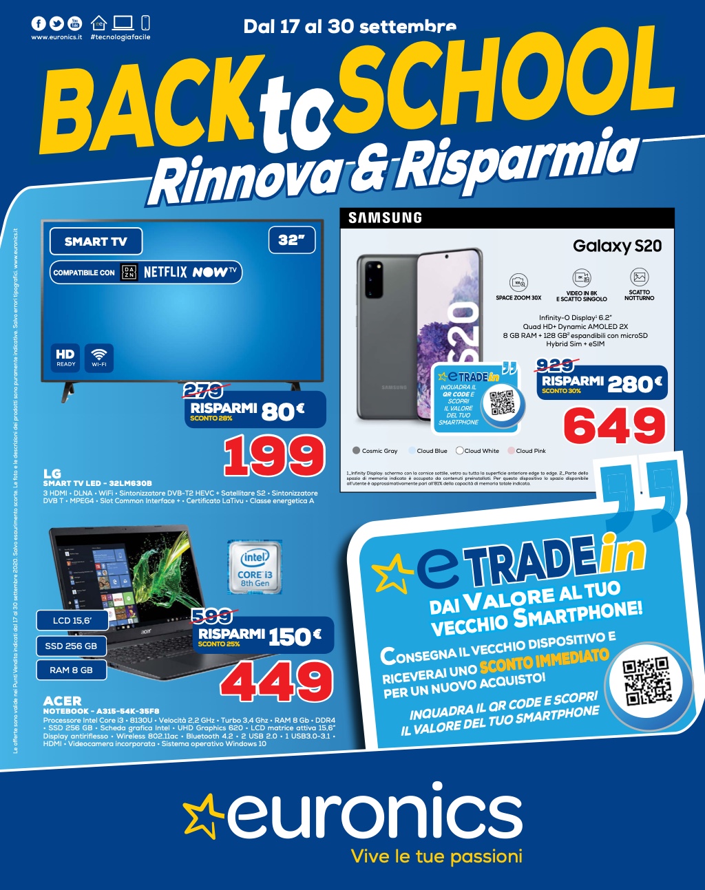 Seguendo Comet e Carrefour, anche Euronics lancia il nuovo volantino di settembre, con il nome (non casuale) Back to school, che proporrà – in vista del ritorno tra i banchi di scuola – sconti fino al 30% e il finanziamento a tasso zero su un buon numero di prodotti di elettronica, in particolare PC.