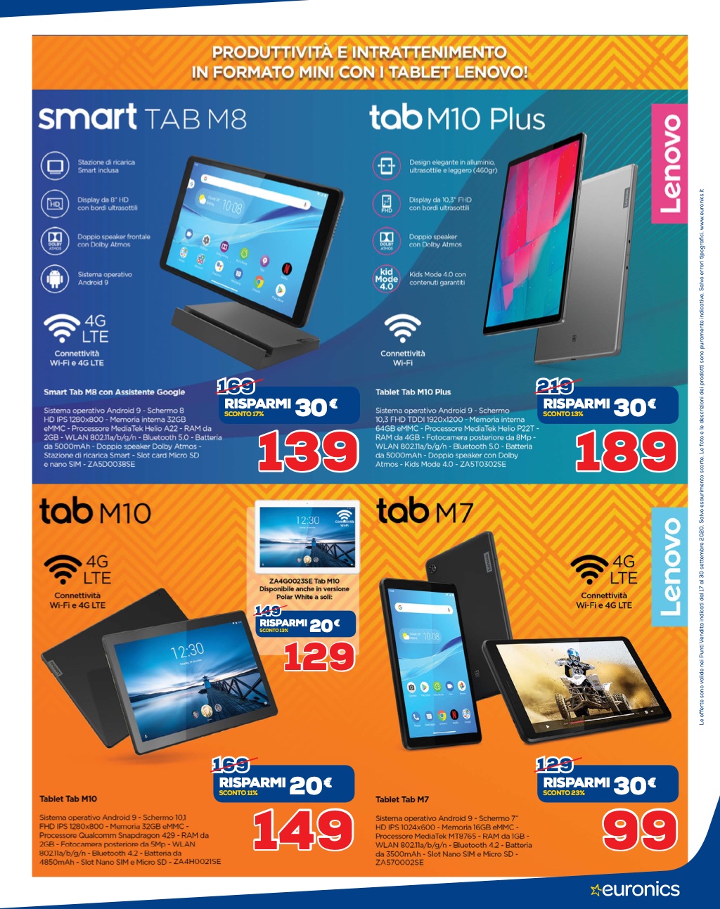Il volantino Euronics, valido fino al 30 settembre ma in negozi di Lazio e Lombardia, vi garantisce un risparmio fino a 200 euro su diversi smartphone Android, per i quali sarà possibile usufruire in alcuni casi di un finanziamento in 20 rate mensili a tasso zero (TAN 0%, Taeg 0%). Gli smartphone non sono però, come anticipato, gli unici prodotti interessanti in promozione, per cui abbiamo comunque deciso di segnalarvi di seguito le migliori offerte anche su smart TV, stampanti, notebook e tablet (NdR, per le altre vedasi questo link).