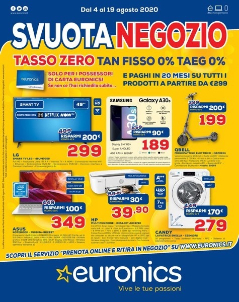 Siete alla ricerca di smartphone, notebook, smart TV e tanto altro in offerta? In queste ore Euronics lancia il volantino “Svuota Negozio” che, dal 4 agosto fino al 19 agosto, vi permetterà di acquistare tantissimi prodotti in offerta oppure a tasso zero (TAN e TAEG 0%) con rate in 20 mesi per tutti i prodotti a partire da 299 euro.