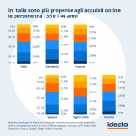 L’analisi prosegue evidenziando come in tutti i Paesi in cui è presente idealo, ad eccezione della Francia, la maggior parte delle ricerche online venga effettuata da uomini; questo dato trova conferma anche in Italia, dove il loro peso è pari al 61,7%, mentre quello delle donne si attesta al 38,3%. Per quanto attiene alle fasce d’età, invece, gli acquirenti tra i 35 e i 44 anni rappresentano il 26,8% del totale, seguiti dai 25-34enni (23,4%) e dai 45-54enni (21,5%). Dati decisamente diversi, invece, in Germania, Francia e Austria, dove la quota più alta è quella dei 25-34enni.