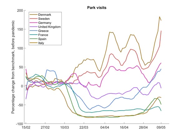I colleghi di TheNextWeb hanno raccolto tutti questi dati realizzando alcuni grafici estremamente interessanti. Durante queste settimane di quarantena, il tempo passato a casa dagli italiani è cresciuto del 30-35%, mentre in altre nazioni si è visto un incremento di circa l’8-15%. In picchiata anche il tempo trascorso al parco, dove gli italiani e spagnoli hanno visto un calo delle visite di oltre l’80%, dove invece altri paesi più permissivi come Germania, Danimarca e Svezia hanno registrato un incremento del tempo passato al parco.