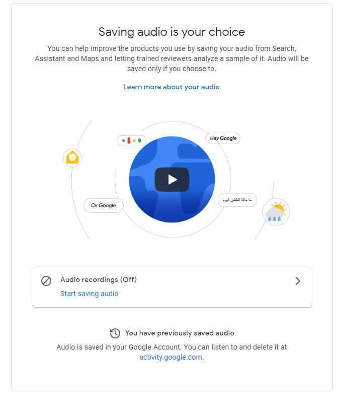 Infatti, Google annuncia che, per garantire un maggiore controllo alle impostazioni relativi all’immagazzinamento delle registrazioni audio, la funzione viene automaticamente disattivata fino a quando l’utente non la riattiverà manualmente.
