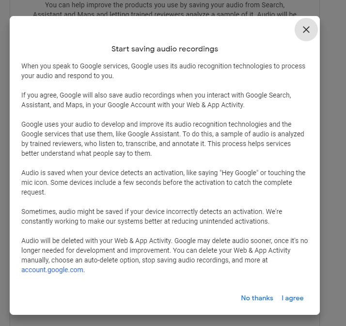Nel caso in cui vogliate riattivare nuovamente le registrazioni audio per permettere a Google di migliorare la qualità dei prodotti come ad esempio Ricerca Google, Assistente Google, Google Maps e tante altre, vi basterà semplicemente visitare questo link e cliccare sulla voce “Audio recordings (Off)” e cliccare su “I agree” a livello della finestra informativa di Google.