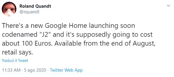 Dopo avervi svelato in anticipo il modello di smart speaker che prenderà posto Google Home, si torna nuovamente a parlare della gamma di dispositivi per la smart home che il colosso di Mountain View presenterà durante la seconda metà del 2020. Secondo le ultime informazioni circolate in rete e a seguito di un tweet di Roland Quandt, scopriamo che Google avrebbe in serbo un nuovo smart speaker evidentemente da lanciare assieme al nuovo Google Home (nome in codice “Prince”).