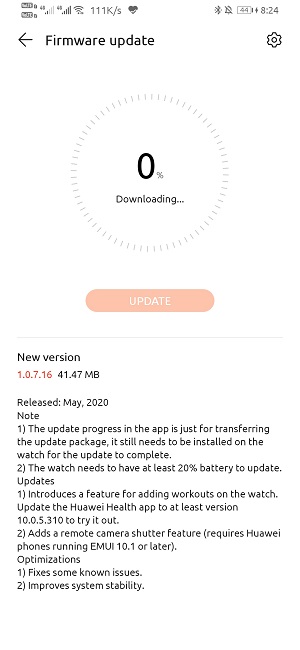 Tale update ha un “peso” di 41,47 MB e porta il firmware dello smartwatch del produttore cinese alla versione 1.0.7.16, introducendo una feature una che consente all’utente di aggiungere allenamenti sull’orologio (richiede l’app Huawei Health versione 10.0.5.310 o più recente) e una funzione di scatto da remoto (richiede che lo smartphone connesso abbia almeno EMUI 10.1).