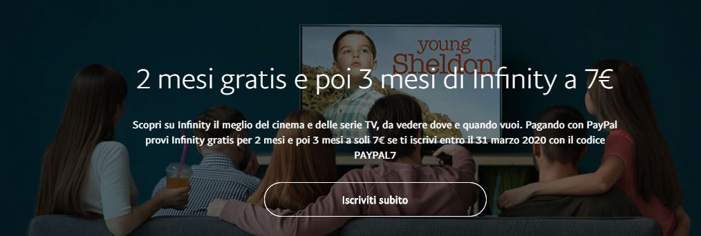 Buone notizie per gli utenti che, in questi giorni in cui l’emergenza Coronavirus ci costringe a stare in casa, sono alla ricerca di soluzioni per trascorrere il tempo e sconfiggere la noia: chi si iscrive a Infinity TV per la prima volta e utilizza PayPal come metodo di pagamento potrà usufruire di un’interessante promozione.