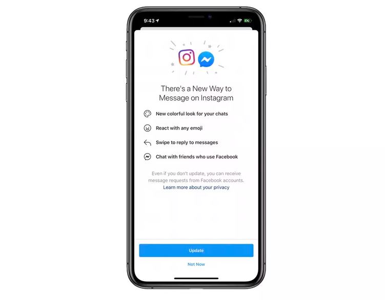 Nelle scorse ore, infatti, sono aumentate le segnalazioni degli utenti sia Android che iOS che hanno notato una schermata di aggiornamento nell’app di Instagram con il messaggio “C’è un nuovo modo per inviare messaggi su Instagram” e un elenco di feature come “un nuovo look colorato per le tue chat”, la possibilità di reagire con emoji o di rispondere con uno swipe e “chatta con gli amici che usano Facebook”.