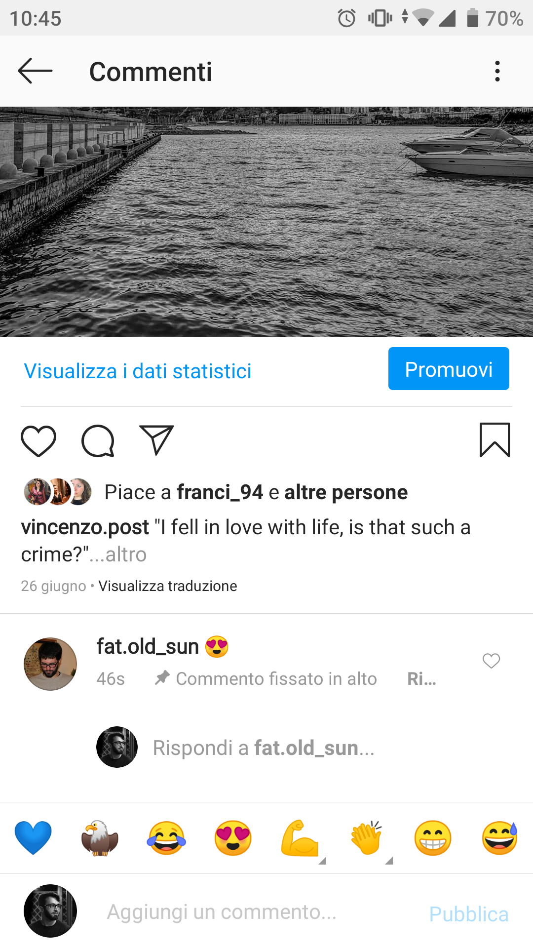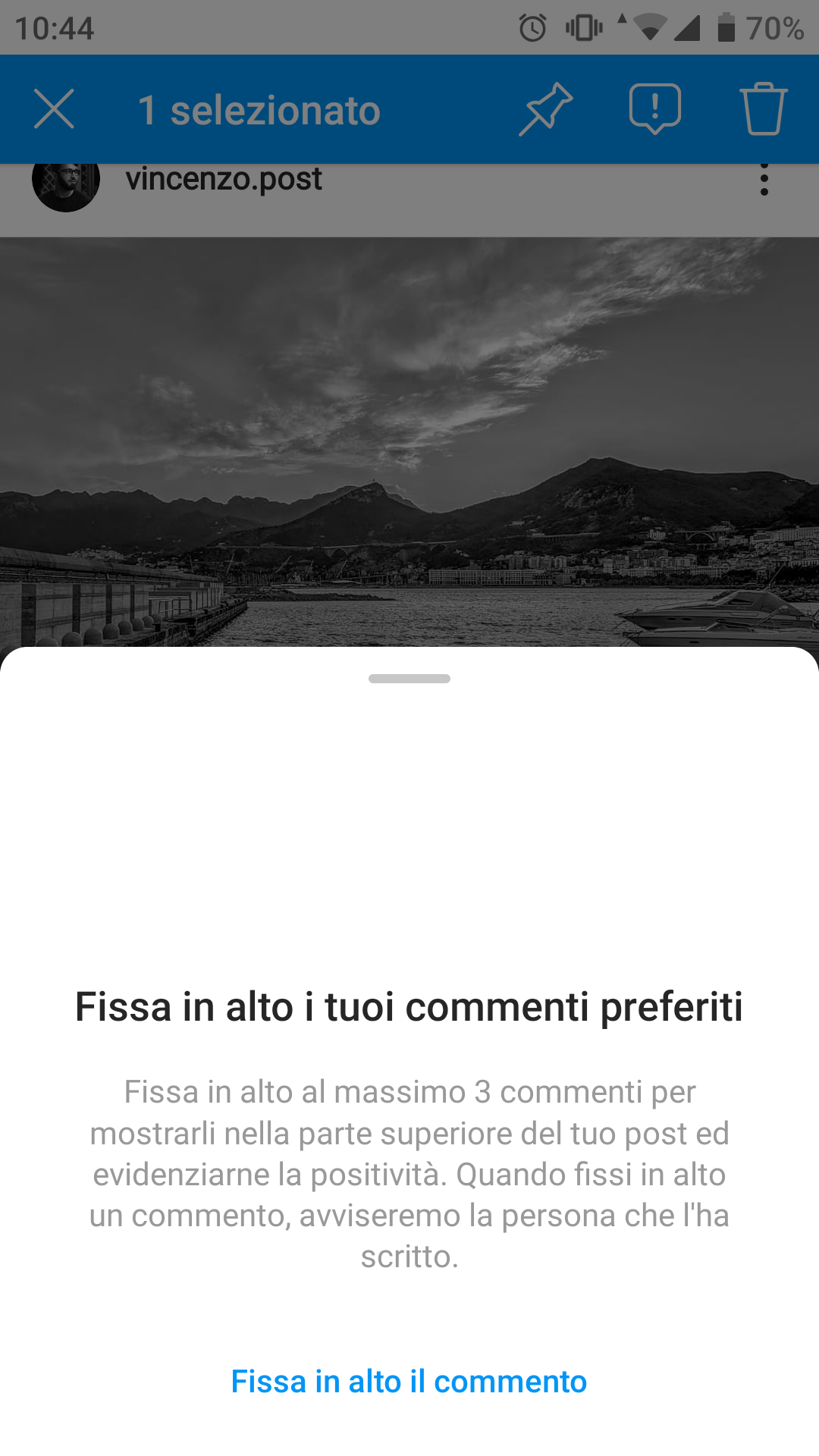 Per bloccare un commento in alto è sufficiente scorrere verso sinistra sullo stesso e selezionare l’icona della puntina alla sinistra della barra che si scoprirà con lo swipe.