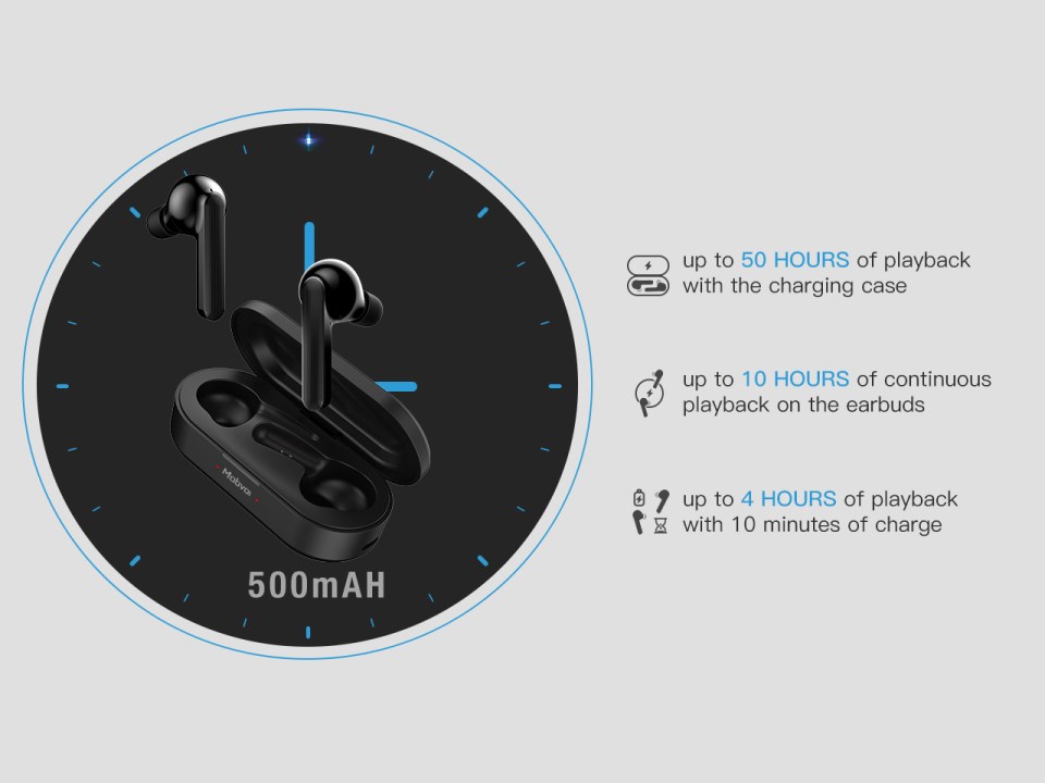 La caratteristica di spicco delle cuffie Mobvoi Earbuds Gesture è rappresentata dalle 50 ore di autonomia complessiva, considerato che la maggior parte delle cuffie true wireless offre al massimo 20-30 ore.