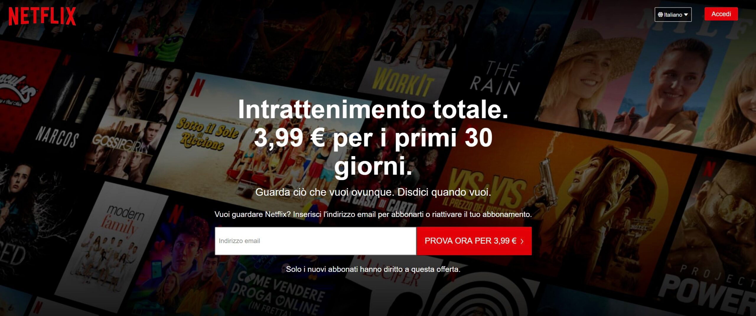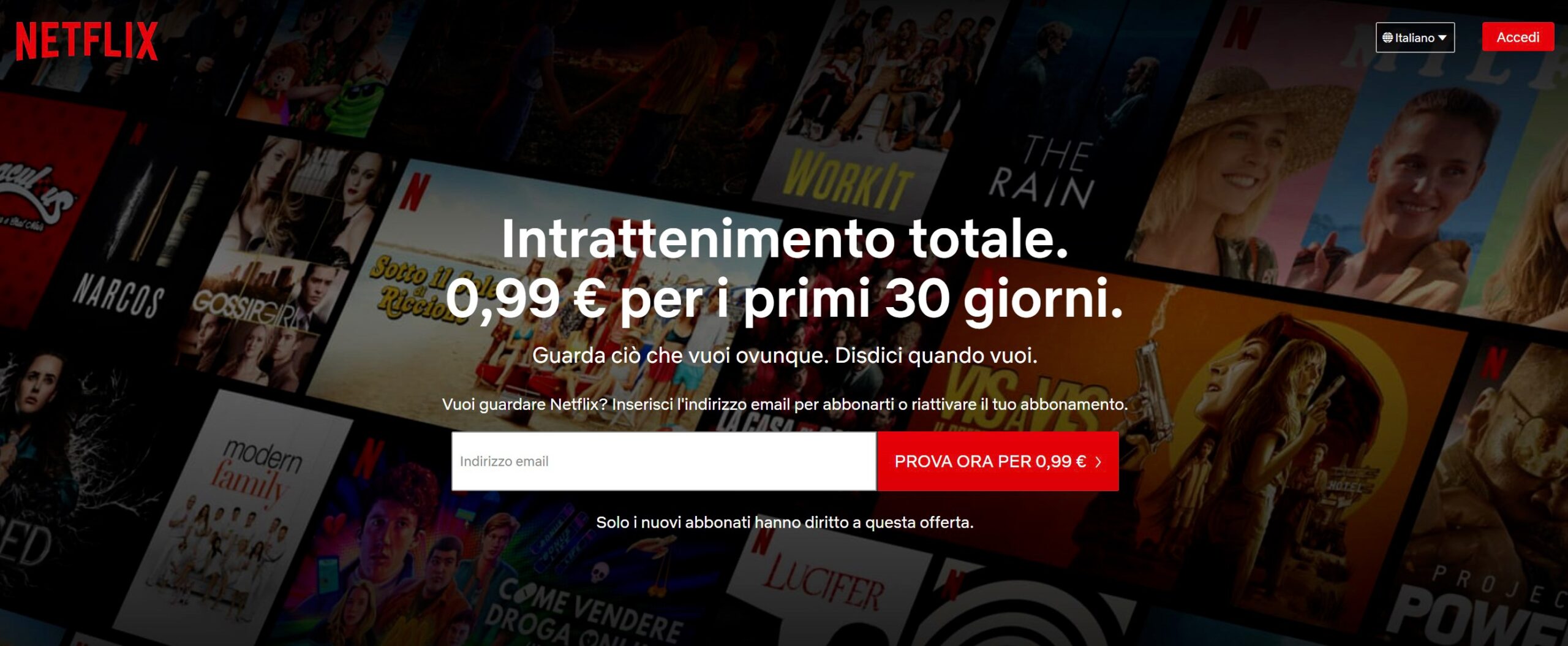 Altri utenti invece possono godere della medesima offerta a un prezzo ancora più conveniente, appena 0,99 euro (ma abbiamo visto anche un’offerta a 0,05 euro). Si tratta dunque di un’ottima opportunità per provare, per 30 giorni, la qualità del servizio Netflix. Anche in questo caso è possibile dare disdetta prima del rinnovo qualora l’utente non dovesse essere soddisfatto della qualità o dei contenuti.