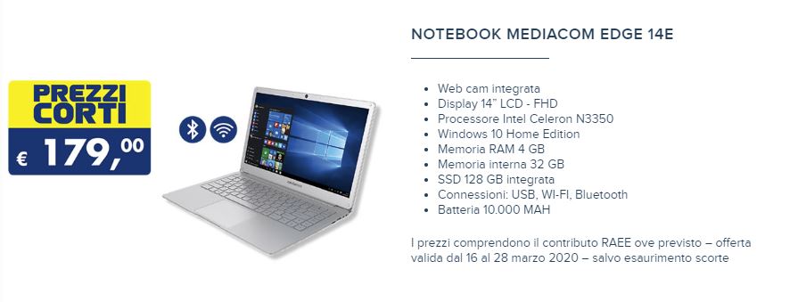 Torniamo nuovamente a parlare di una interessante offerta di Esselunga per quanto riguarda l’acquisto di un dispositivo hi-tech. In questo caso l’Offerta Tech del supermercato italiano riguarda il notebook Mediacom Edge 14E, un prodotto economico e adatto ad un utilizzo per lo più casalingo, senza troppe pretese.