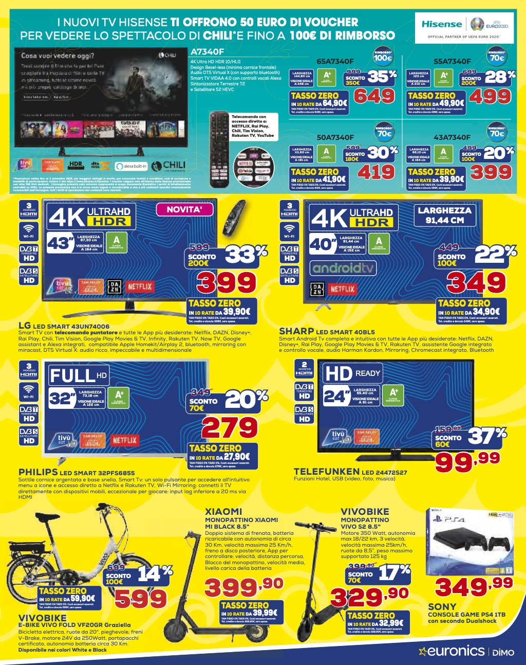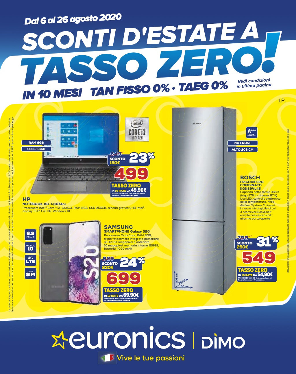 Il nuovo volantino “Sconti d’estate a tasso zero!” di Euronics Dimo è attivo da oggi, 6 agosto, e rimarrà valido fino al 26 agosto prossimo e prevede la possibilità di pagare in 10 mesi a tasso zero (TAN Fisso 0% – TAEG 0%) gli acquisti di importo compreso tra 200 e 3.000 euro, con la prima rata a 30 giorni.