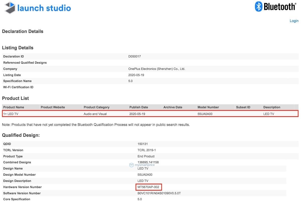 Secondo la certificazione, il numero di modello di questa OnePlus TV è 55UA0A00 che rivela le dimensioni del pannello. La scheda sulla piattaforma di certificazione evidenzia che OnePlus 55UA0A00 è una TV LED dotata di connettività Bluetooth v5.0 e che impiega lo stesso chipset MediaTek MT5607 presente nelle TV di prima generazione della serie Q1.