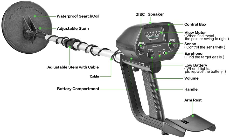 Ci sono una uscita per le cuffie, una spia per segnalare che le batterie sono scariche, uno speaker, una rotella per regolare il volume e soprattutto ci sono un indicatore analogico classico, con lancetta, per segnalare quando ci si avvicina a un oggetto metallico, una rotella per regolare la sensibilità e una rotella per scegliere se rilevare tutti i metalli o solamente alcuni.