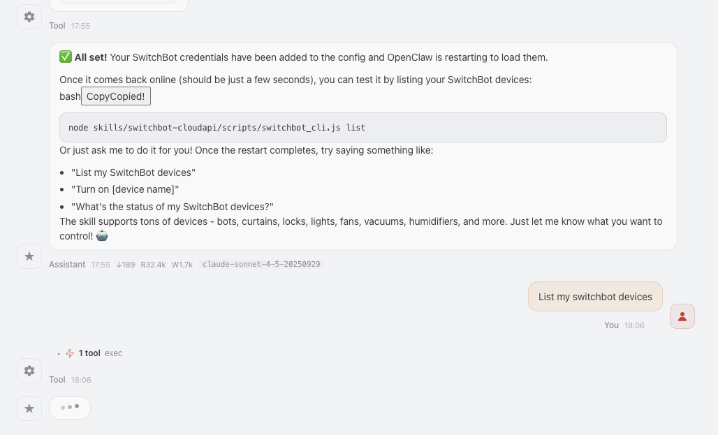 L’aspetto che ci ha convinto di più non è la funzione in sé, ma il modo in cui OpenClaw si è comportato durante la configurazione del plugin per SwitchBot. Gli abbiamo chiesto di installare l’integrazione necessaria per controllare i dispositivi SwitchBot dall’interfaccia di OpenClaw, senza fornirgli alcun file, alcun URL o alcuna istruzione specifica. L’agente ha trovato autonomamente il plugin, ha gestito l’installazione, ha incontrato un errore durante il processo, lo ha analizzato, ha corretto la causa senza che noi intervenissimo, e ha completato la configurazione in modo del tutto indipendente. Non è una funzione promessa sulla scatola: è quello che abbiamo visto accadere davvero, e rappresenta un salto qualitativo rispetto a qualsiasi automazione tradizionale che si possa configurare in Home Assistant o nell’app SwitchBot.