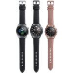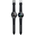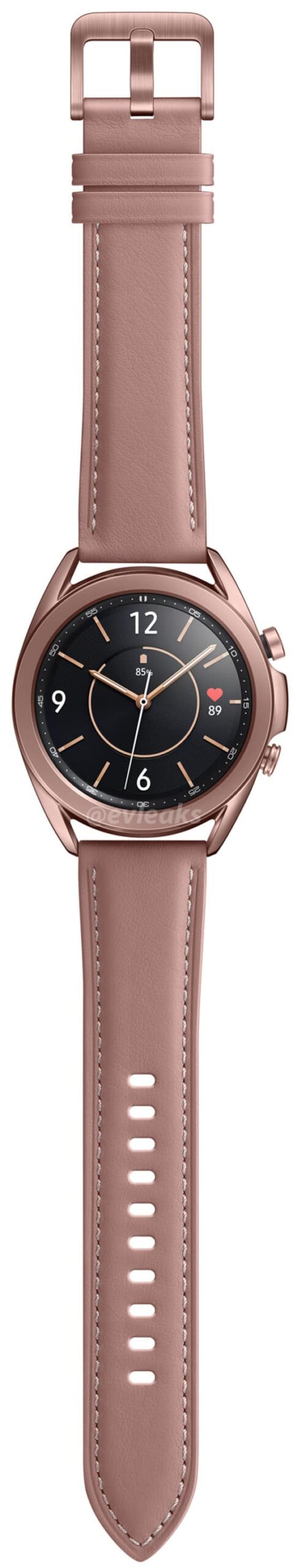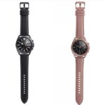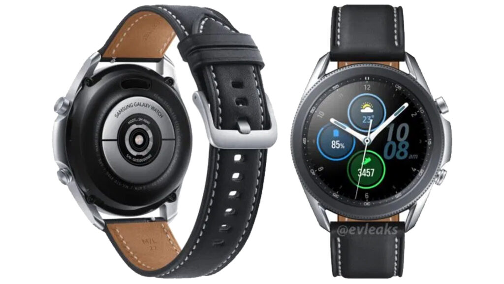Da questa immagine è possibile notare Samsung Galaxy Watch 3 nella variante da 45 mm – ricordiamo che il wearable è atteso anche con cassa da 41 mm con display da 1,2 pollici – con i due tasti laterali incastonati nella cassa circolare.