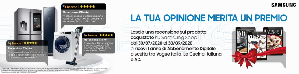 Samsung svela la nuova promozione “la tua opinione ti premia!” tramite cui mette in premio un anno di abbonamento gratuito ad alcune riviste digitali a scelta fra Vogue Italia, La Cucina Italiana e AD, a seguito di una recensione rilasciata su Reevo relativa all’acquisto di uno dei prodotti presenti in calce all’articolo.
