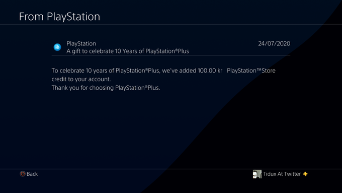 Il messaggio con cui Sony annuncia tale iniziativa è il seguente: “Per celebrare i dieci anni di PlayStation Plus, abbiamo aggiunto 10 dollari di credito PlayStation Store al tuo account. Grazie per aver scelto PlayStation Plus“.