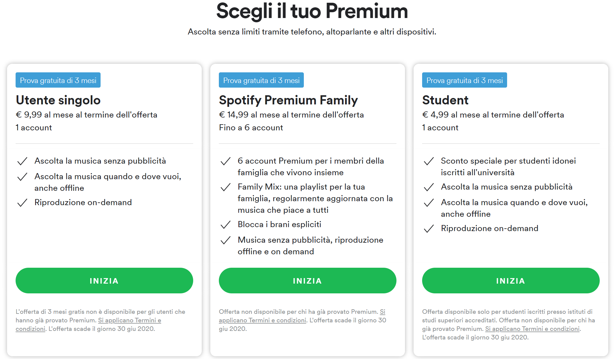 L’offerta è disponibile per la prima volta direttamente su Spotify.com/Premium e permette di accedere al servizio nella sua forma più completa, con più di 50 milioni di tracce disponibili on-demand, nessun annuncio o interruzione pubblicitaria e l’accesso a 450.000 titoli podcast. Questa nuova offerta, come sottolineato da Spotify, è valida fino al 30 giugno 2020 su tutti i piani Spotify Premium a livello globale: Utente singolo, Student e Spotify Premium Family.