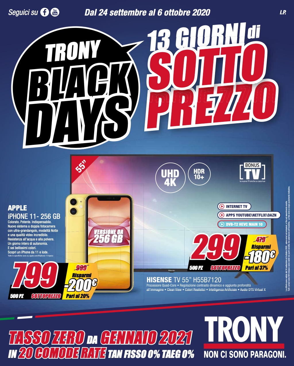 Trony si dimostra pronta a sorprendere i suoi clienti, e, nonostante manchino ancora alcune settimane al Black Friday, lancia una nuova interessante campagna di volantini, accomunati dal periodo di validità delle offerte, ma che variano da regione a regione: si tratta di due volantini, da un lato Black Days, dall’altro Black Friday Autumn Special Edition.