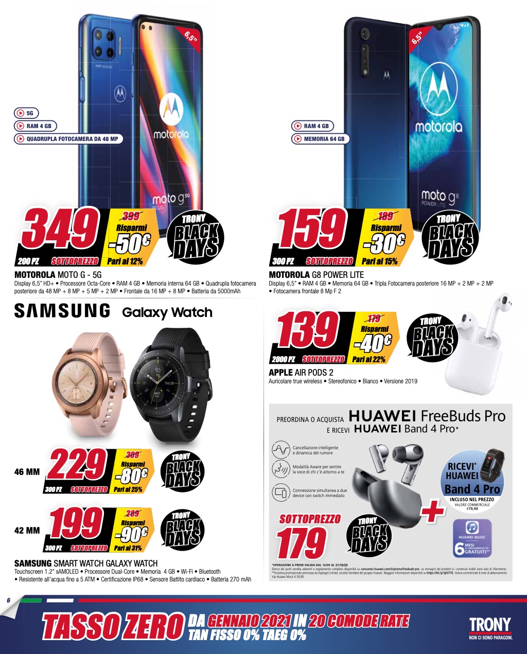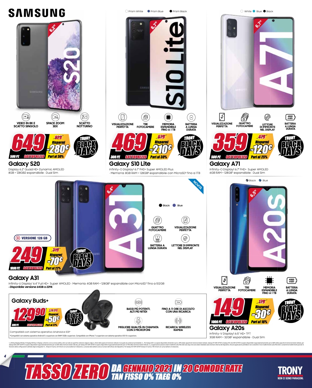 Il primo volantino si chiama Black Days, è valido fino al 6 ottobre 2020 solo in Lombardia, Piemonte, Toscana, Affi, Trentino-Alto Adige, e promette 13 giorni di “Sotto prezzo” su una vasta gamma di prodotti di elettronica (TV, notebook, fotocamere). A dirla tutta, piuttosto interessanti sono le offerte che riguardano gli smartphone Android e non, per cui è previsto, nella maggior parte dei casi, la possibilità del finanziamento a tasso zero (per tutte le altre si veda questo link):