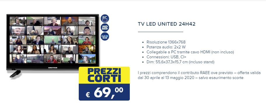Il TV United da 24 pollici è disponibile da oggi 30 aprile fino al prossimo 13 maggio al prezzo di 69 euro salvo esaurimento scorte. Se siete interessanti al prodotto vi consigliamo di cliccare il link qui in basso per scoprire i punti vendita in cui acquistarlo.