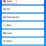- tramite le impostazioni dell’applicazione di Facebook. Per raggiungere il pannello bisogna tappare sulle tre linee orizzontali presenti in alto a destra > Avatars. Nel caso in cui la sezione non dovesse essere disponibile, la trovate tappando sul pulsate “Altro…”.