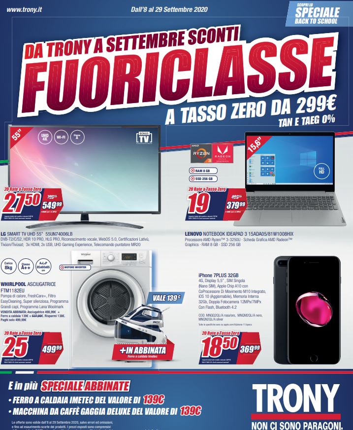 Se “Una montagna di sconti” non vi dovesse bastare, sappiate che Trony ha lanciato proprio oggi, 8 settembre 2020, un nuovo volantino con tante offerte degne di nota disponibili fino al 29 settembre 2020.