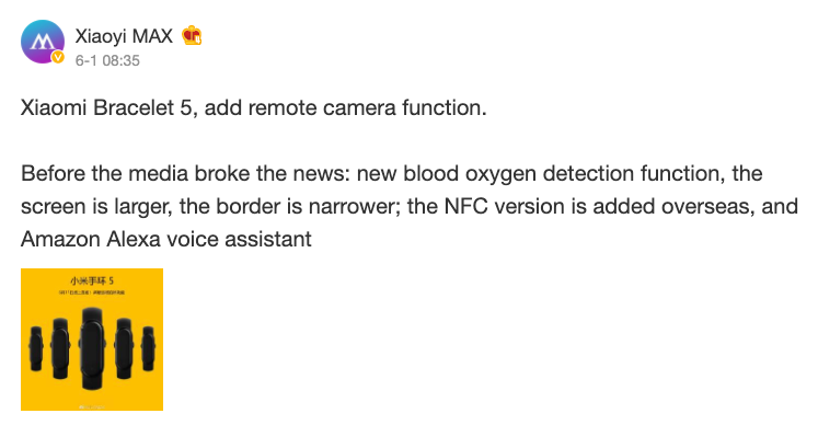 Grazie a un leaker, che ha pubblicato il leak su Weibo, scopriamo che Xiaomi Mi Band 5 dovrebbe consentire di scattare foto con la fotocamera dello smartphone, come una sorta di tasto aggiuntivo, di monitorare la presenza d’ossigeno nel sangue (SpO2), avere un display più grande rispetto a quello del modello precedente, con cornici più sottili e, soprattutto, dovrebbe avere il supporto ai pagamenti contactless a livello globale, grazie alla presenza dell’NFC, e i comandi vocali tramite l’assistente Amazon Alexa.