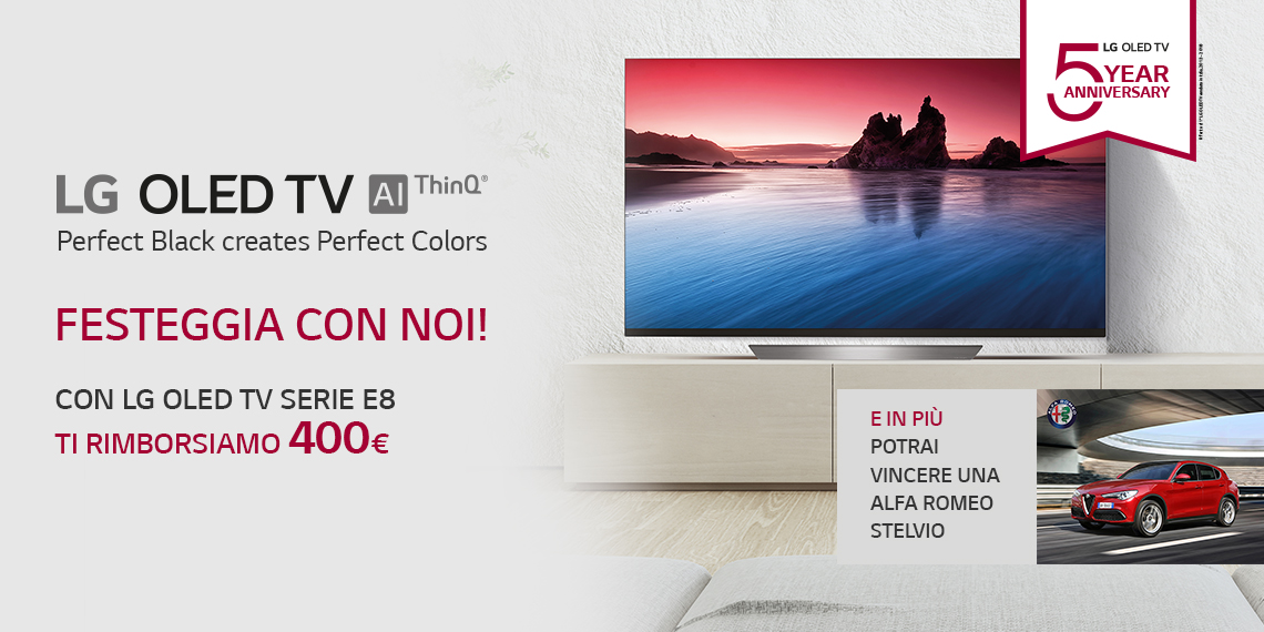 Per festeggiare i 5 anni di presenza nel mercato delle Smart TV OLED, LG sta proponendo un’interessante promozione che permette di avere un rimborso di ben 400 euro sull’acquisto di una LG OLED TV della serie E8, ovvero quella riconosciuta da molti come la miglior serie di Smart TV disponibile ad oggi sul mercato, così come partecipare all’estrazione di una Alfa Stelvio.