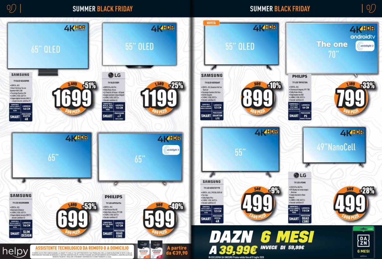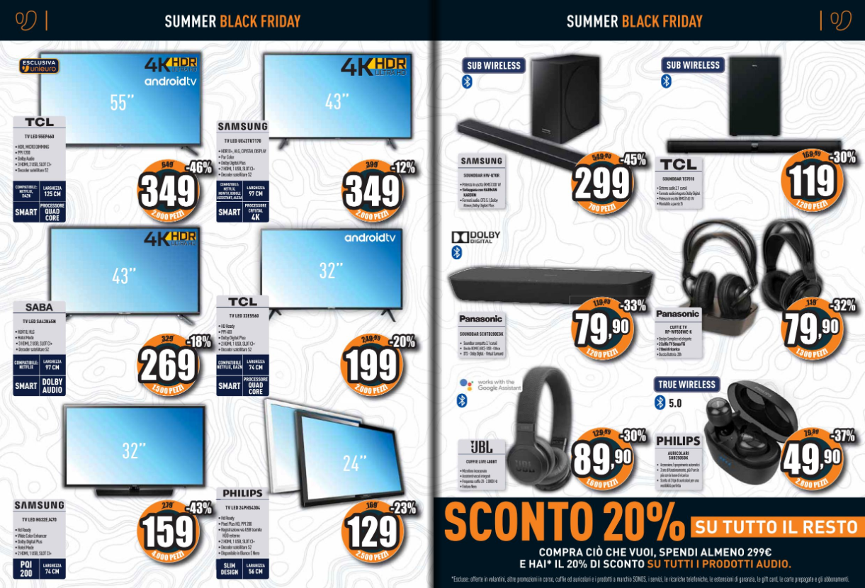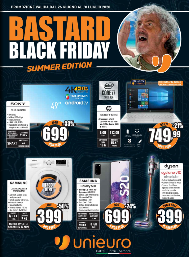 La promozione Bastard Black Friday Unieuro (Summer Edition) è valida da oggi, 26 giugno 2020, fino all’8 luglio 2020, e comprende tantissimi prodotti di elettronica anche nei punti vendita fisici. Alcune delle proposte principali vengono subito “anticipate” dalla copertina del volantino, e tra queste troviamo lo smartphone Samsung Galaxy S20 a 699 euro, la TV 4K Sony KD-49XG900S a 699 euro e la scopa elettrica Dyson V10 Absolute a 399 euro.