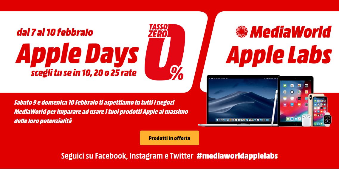Da oggi 7 febbraio e fino all’11 febbraio 2019 Mediaworld ha organizzato due iniziative molto interessanti legati agli iPhone, agli iPad, all’Apple Watch e ai Mac. Stiamo parlando degli Apple Days con finanziamento a tasso 0 mentre, nel week-end del 9 e del 10 febbraio, degli Apple Labs con una serie di tutorial su come usarli al meglio.