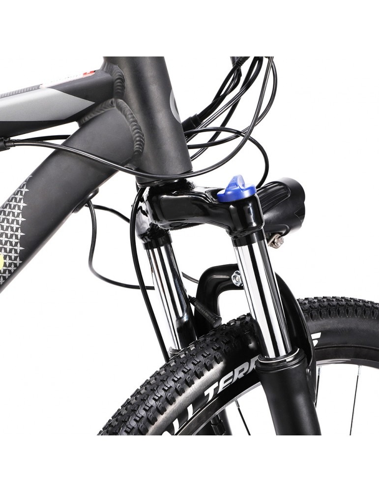 Per garantire una buona maneggevolezza in ogni situazione, dalle strade bianche a quelle cittadine, il produttore ha scelto degli pneumatici da 27,5 pollici con un design che offre una buona tenuta in ogni situazione. Il cambio è realizzato da Shimano e offre 3 corone all’anteriore e 7 pignoni al posteriore, per un totale di 21 diversi rapporti. In questo modo è più semplice trovare sempre il giusto equilibrio per non fare troppa fatica o non pedalare a vuoto.