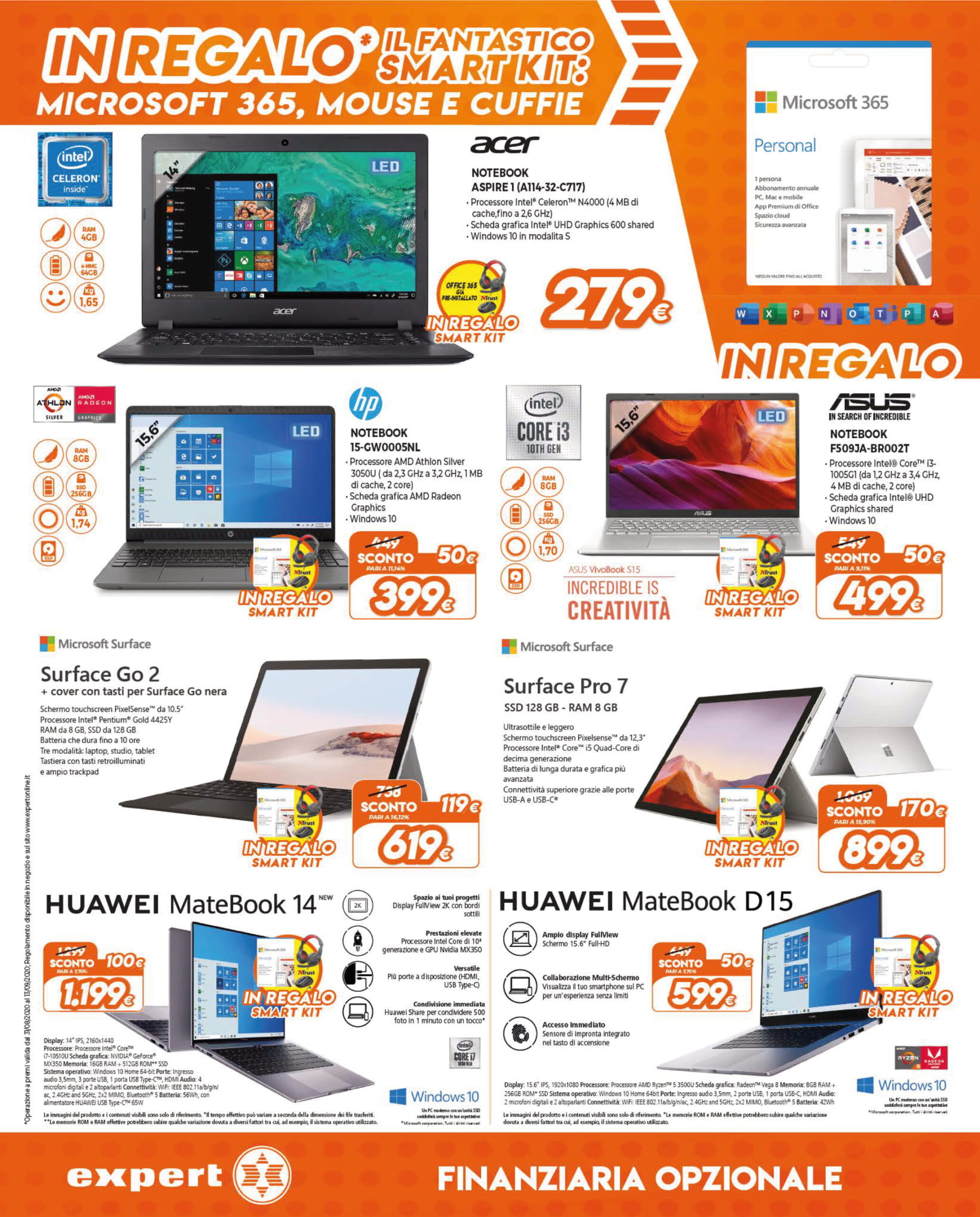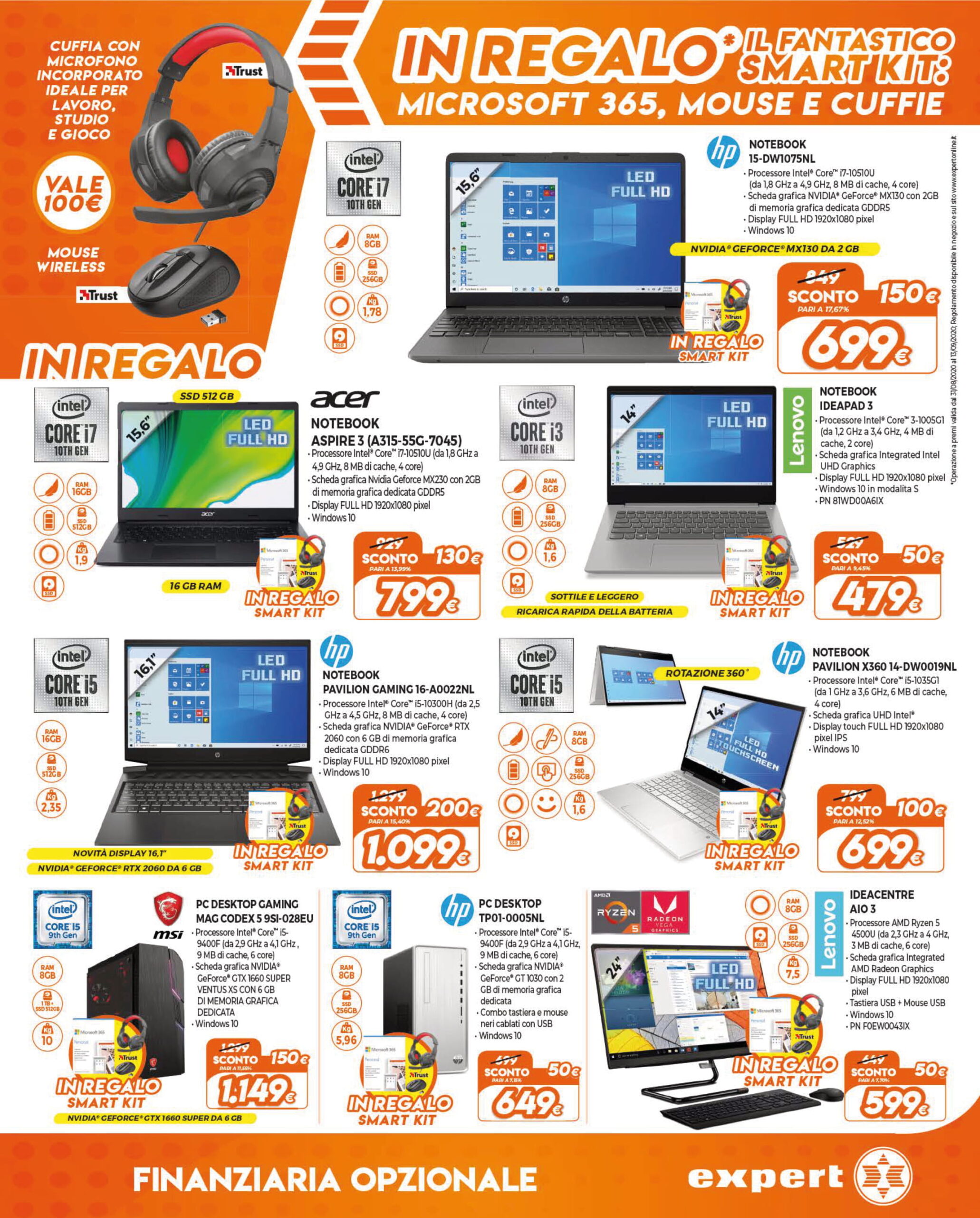 Partiamo col dire che il nuovo volantino Expert è incentrato sul tema del ritorno al lavoro e a scuola in chiave smart e ciò è espresso chiaramente nel titolo e nella promozione che occupa la prima pagina: il notebook HP 15-DW1074NL è proposto a 549 euro e comprende in regalo un kit del valore complessivo di 100 euro formato da Microsoft 365 e cuffie e mouse di Trust. Lo stesso regalo è previsto anche con gli altri notebook e PC fissi in offerta.