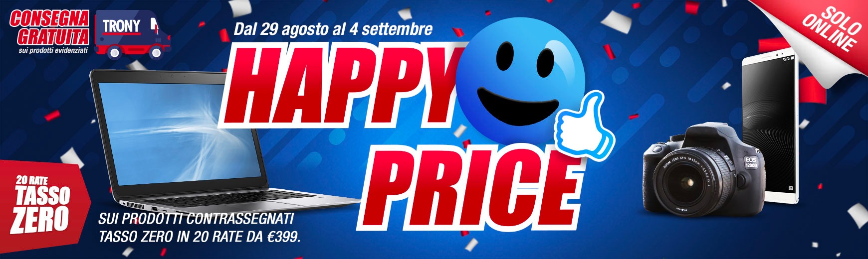 È valida fino a venerdì 4 settembre la nuova promozione Happy Price lanciata dalla nota catena di elettronica di consumo Trony. L’iniziativa è valida esclusivamente online quindi non potrete approfittare degli sconti presso i punti vendita fisici distribuiti sul territorio italiano.