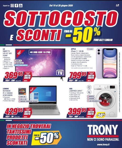 Anche oggi Trony ne lancia un altro. S’intitola “Sottocosto e sconti fino al 50%” ed è un volantino ricco di offerte interessanti su prodotti di vario tipo fra cui smartphone, notebook, smart TV ed elettrodomestici. Ecco tutto quello che c’è da sapere.