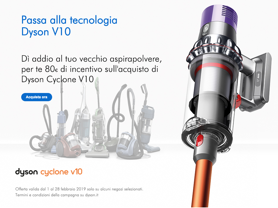 Fino al 28 febbraio acquistando un qualsiasi aspirapolvere della gamma Dyson V10 è possibile ricevere un incentivo di 80 euro, firmando un’autocertificazione in cui l’acquirente dichiara di impegnarsi a smaltire in autonomia il vecchio aspirapolvere, oppure chiamando il servizio clienti Dyson al numero 800976024 e prenotando il ritiro gratuito.