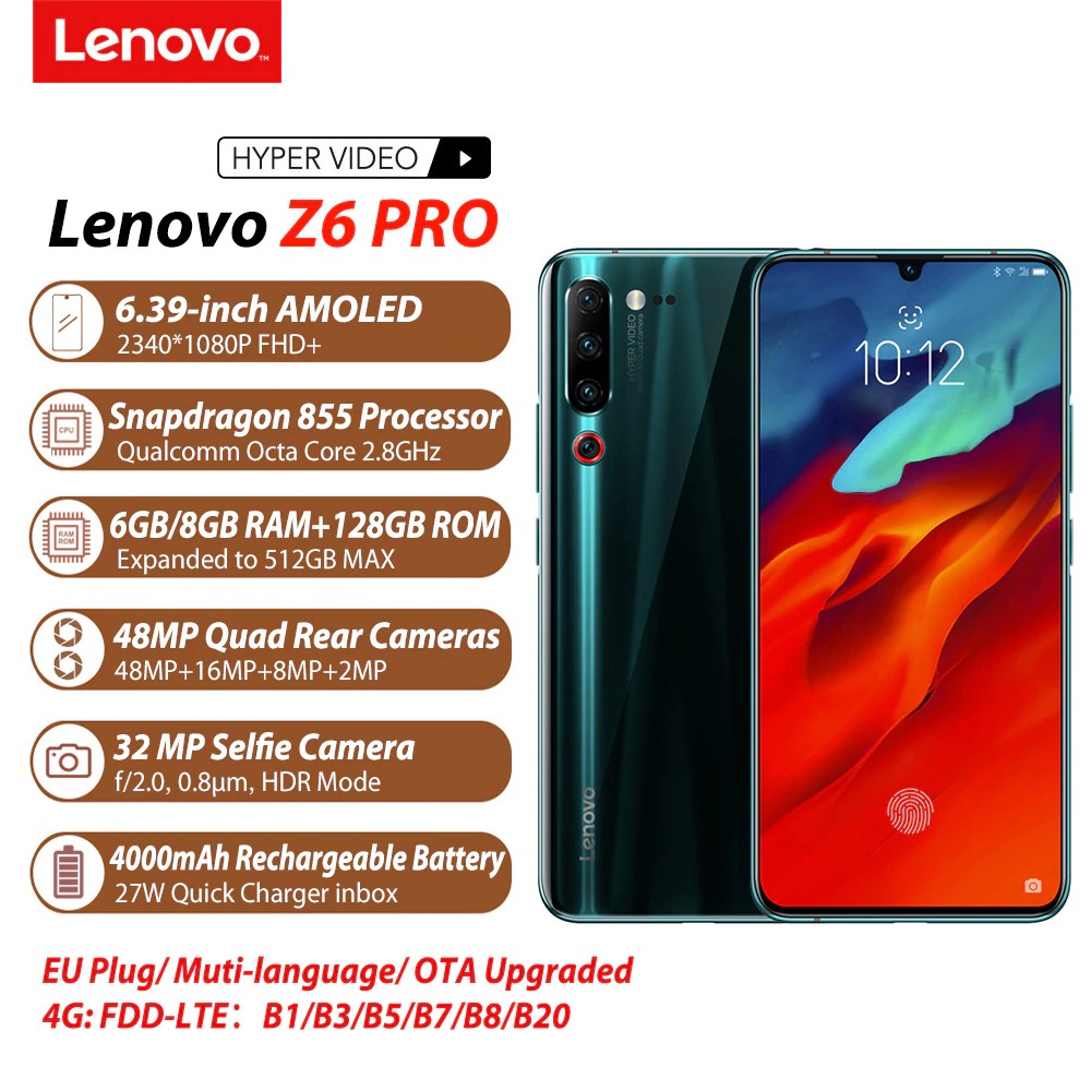 Lenovo Z6 Pro può contare su uno schermo SuperAMOLED FullHD+ da 6,39 pollici, con supporto al formato HDR10 e non a goccia di dimensioni contenute. Sotto alla scocca trovano posto uno Snapdragon 855 con 6 o 8 GB di RAM e 128 GB di memoria interna, espandibile tramite microSD.