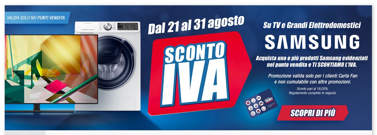 La promozione prevede lo sconto dell’IVA sull’acquisto di Smart TV e grandi elettrodomestici Samsung, ma per approfittare dell’iniziativa è necessario recarsi nei punti vendita fisici Trony.