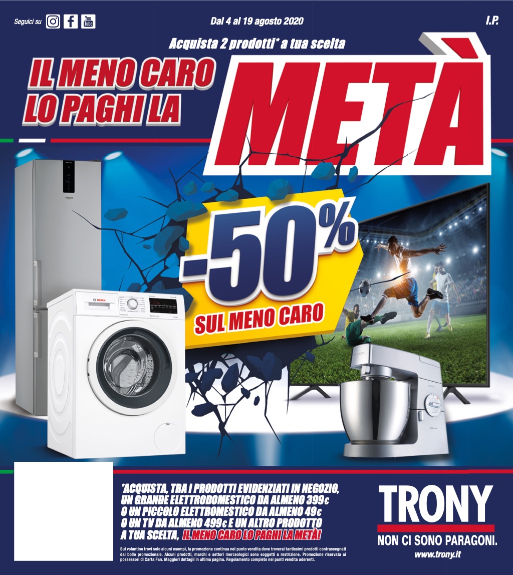 Dopo MediaWorld e Comet, anche Trony festeggia a modo suo le vacanze estive e lancia il volantino Lo paghi la metà, che consente di risparmiare – sull’acquisto di un grande elettrodomestico e di un altro prodotto – il 50% su meno caro, pagandolo così soltanto metà prezzo.