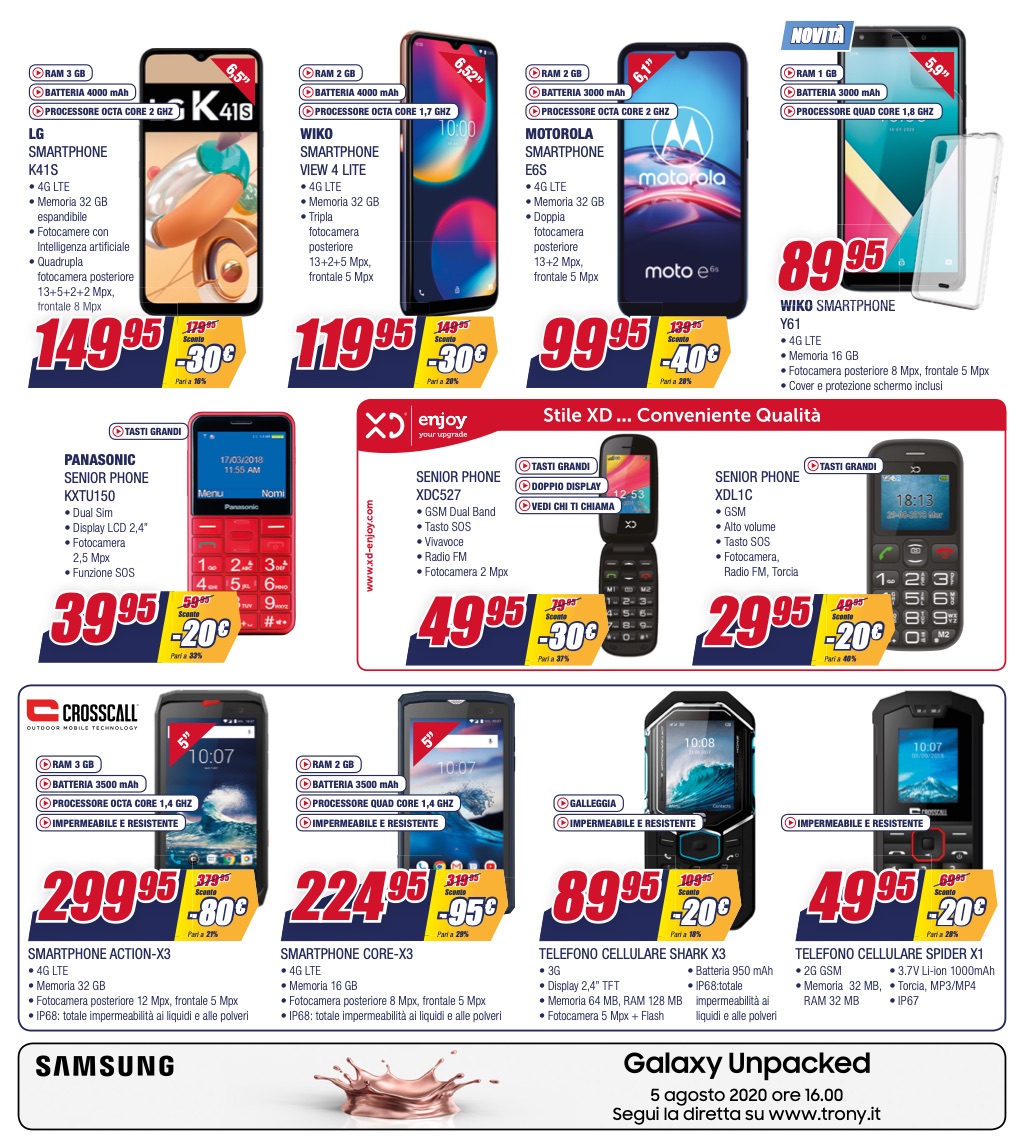 Il volantino di Trony, valido fino al 19 agosto e soltanto in negozi di Veneto, Marche, Umbria, Abruzzo, Molise e Rieti, propone offerte anche su diversi smartphone Android, anche questi scontati del 50% solo in caso di acquisto di un altro prodotto. Gli smartphone non sono però, come anticipato, gli unici prodotti interessanti in promozione, per cui abbiamo comunque deciso di segnalarvi a seguire le migliori offerte anche su vari smart TV, auricolari, notebook e tablet (NdR, per le altre vedasi questo link).