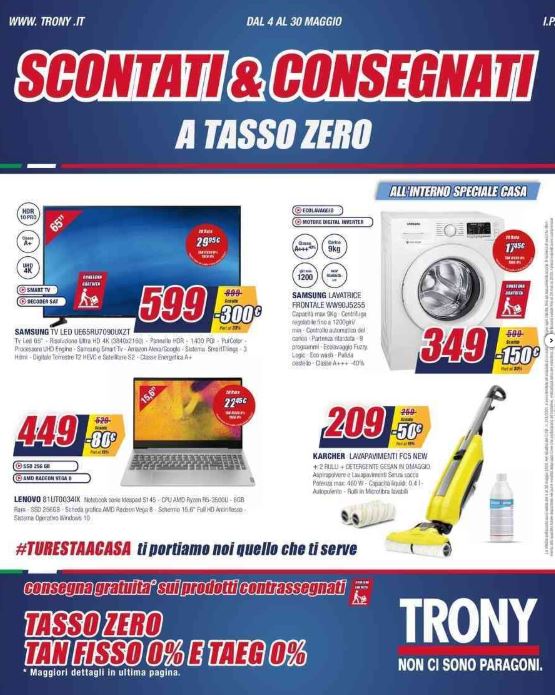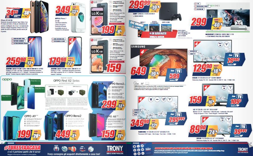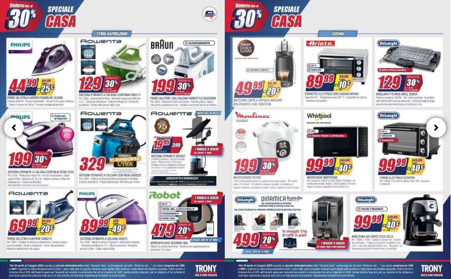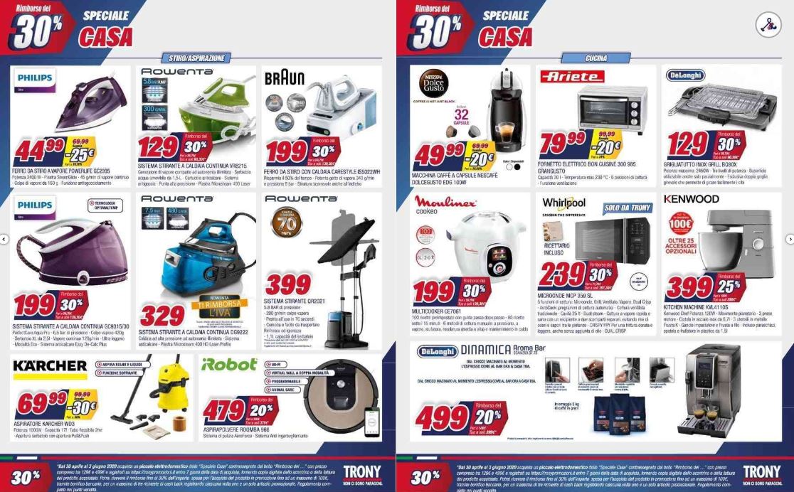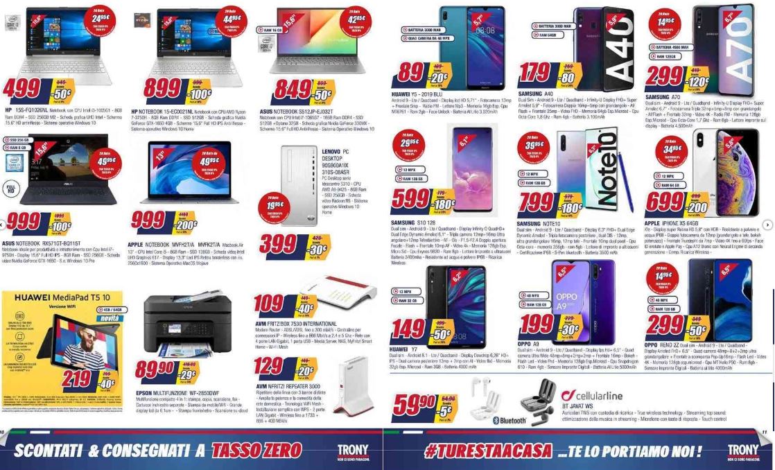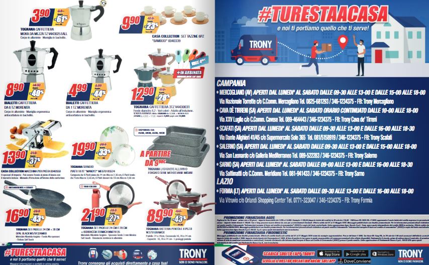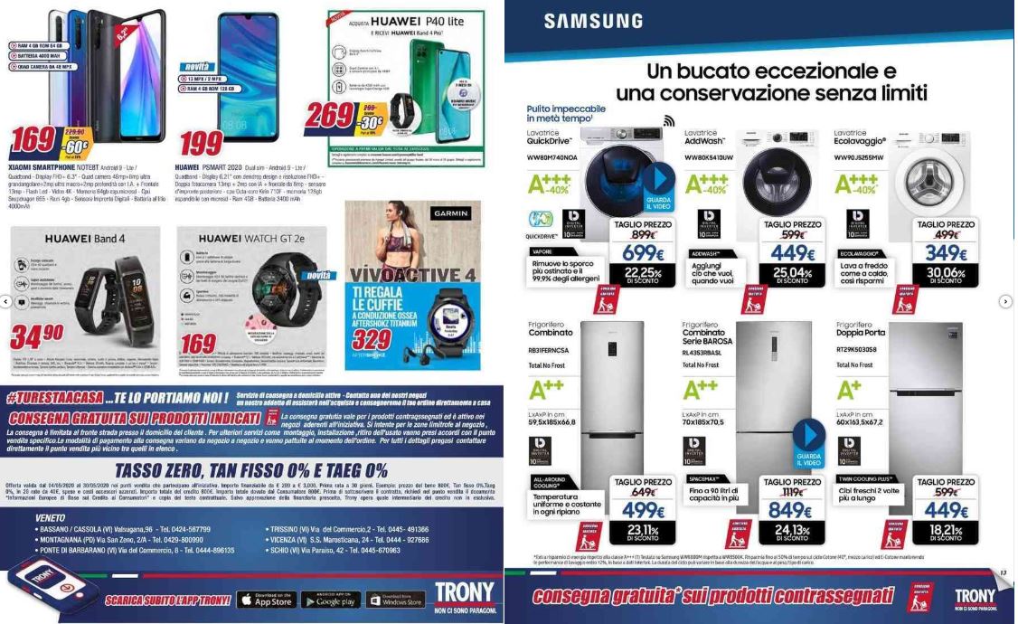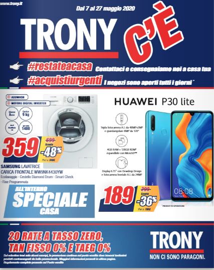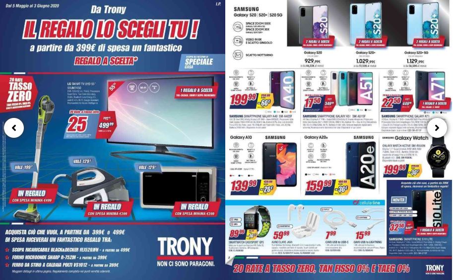Partiamo dal volantino di Trony con la data di scadenza più vicina: “Trony c’è“. Si tratta di uno stampato valido nei punti vendita da oggi fino al 27 maggio 2020 in Campania e a Formia (LT), con i negozi specificati nell’ultima pagina che trovate nella galleria a seguire.