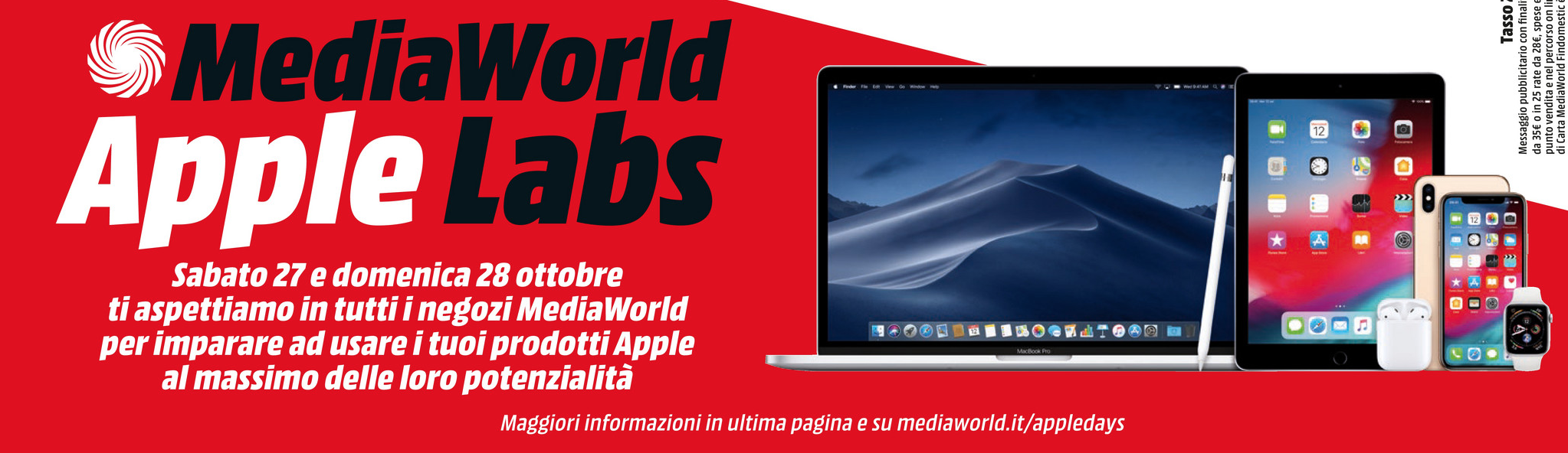 MediaWorld quest’oggi ha inaugurato un nuovo volantino pieno zeppo di offerte interessanti abbinate alla possibilità di un finanziamento in 10, 20 o 25 rate a tasso zero fino al 28 ottobre. A fare da padrone al nuovo volantino MediaWorld è l’annuncio degli Apple Labs il 27 e il 28 ottobre, in cui i dipendenti terranno dei corsi su come utilizzare gli iDevice e i Mac.