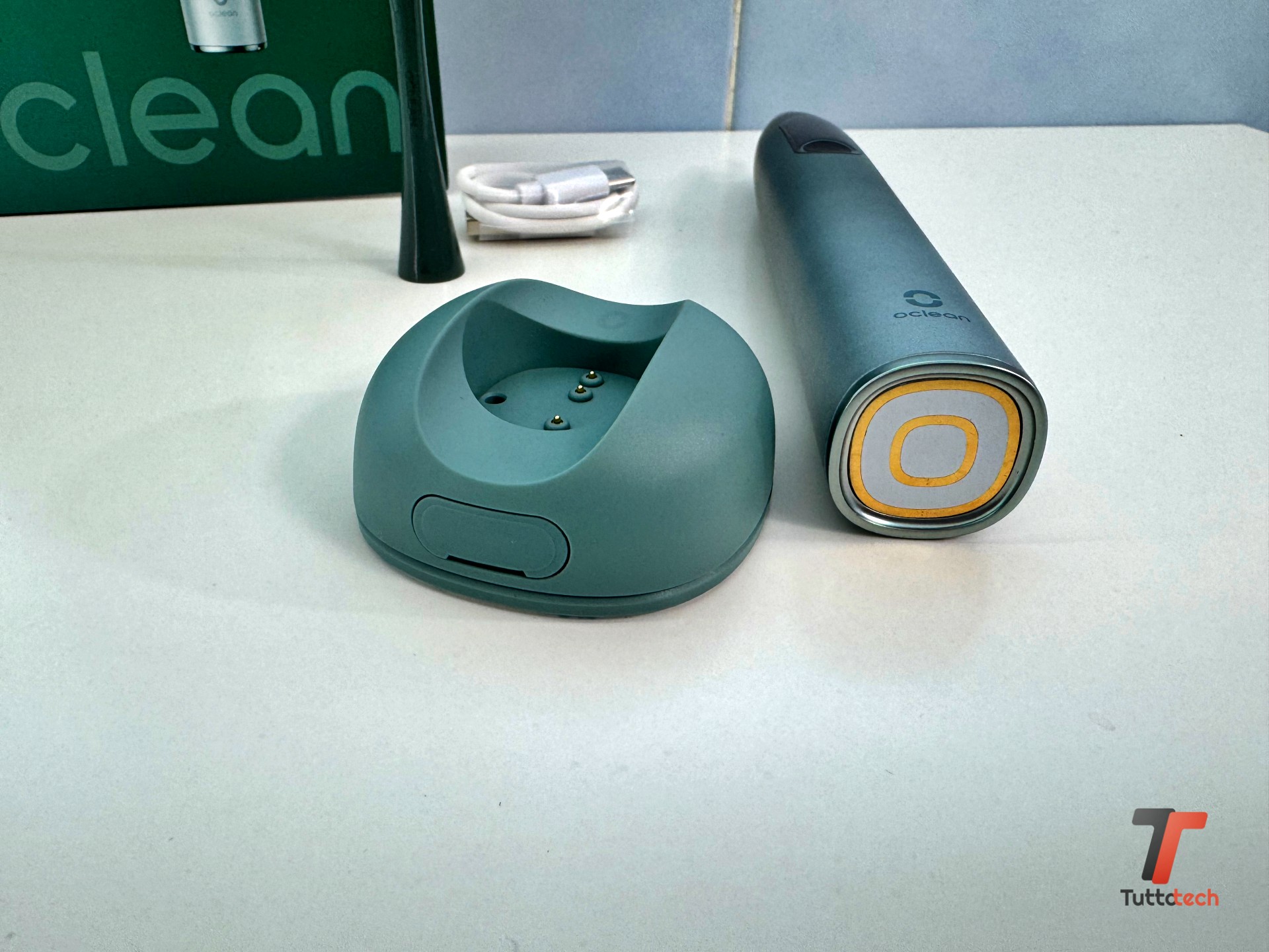 Oclean ci ha da tempo abituati a prodotti solidi, semplici da utilizzare e di qualità, e Oclean X Pro non tradisce assolutamente le aspettative. Lo abbiamo provato nella colorazione verde ma è disponibile anche in quella oro/rosa, molto gradevole. Come da tradizione troviamo un singolo pulsante per avviare la pulizia e subito sopra è presente un piccolo schermo touch a colori che permette di visualizzare le impostazioni, scegliere il programma di pulizia, visualizzare il timer e il punteggio finale al termine della pulizia.