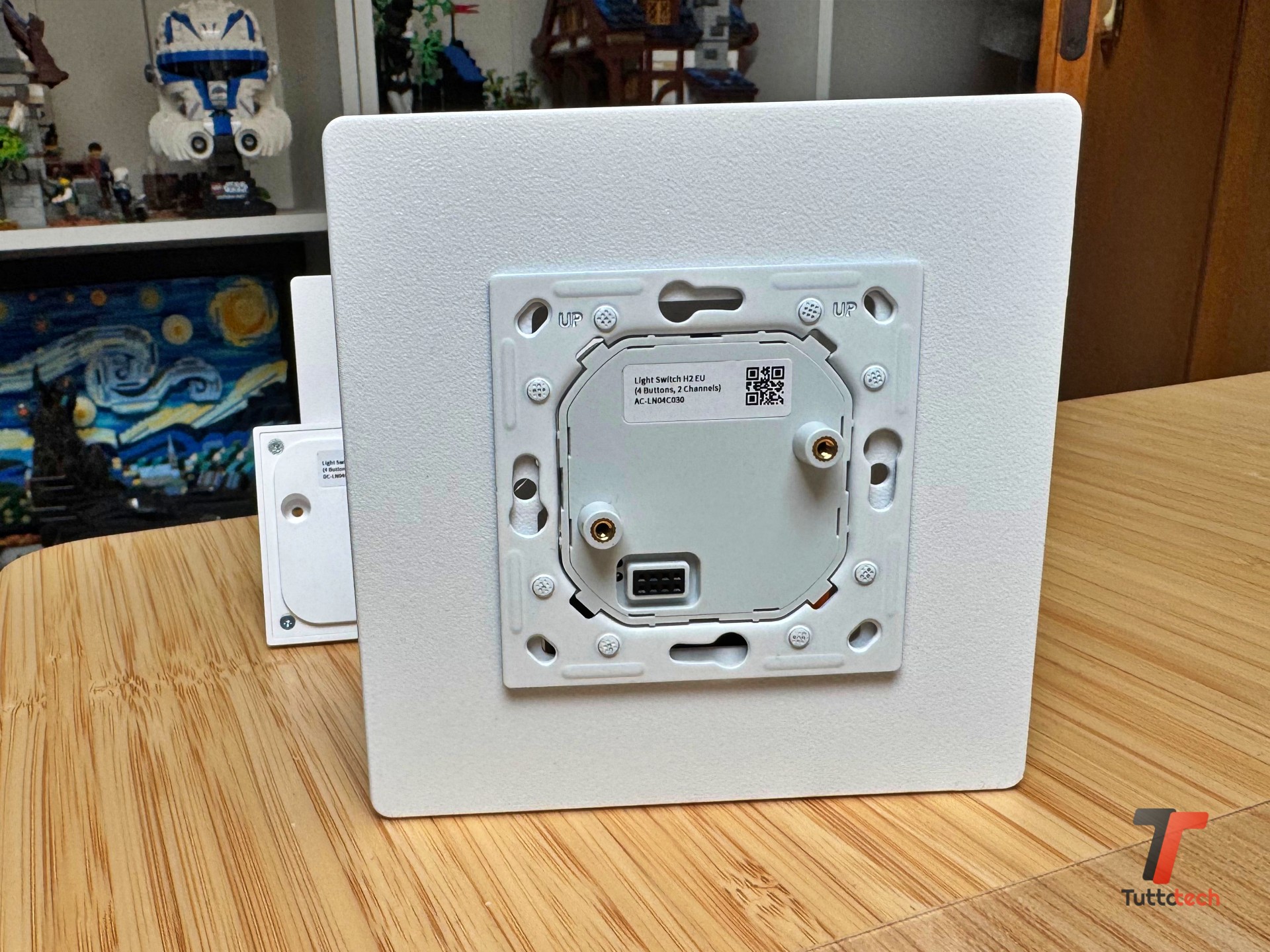 La confezione di vendita è decisamente semplice, con l’interruttore bianco, un paio di viti e altrettanti tasselli per fissarlo alla scatola e un manuale di istruzioni. L’interruttore è adatto ai sistemi modulari da 55 millimetri ma noi siamo riusciti a montarlo senza problema anche su una classica scatola 503 utilizzando un adattatore acquistato per pochi euro su Amazon.